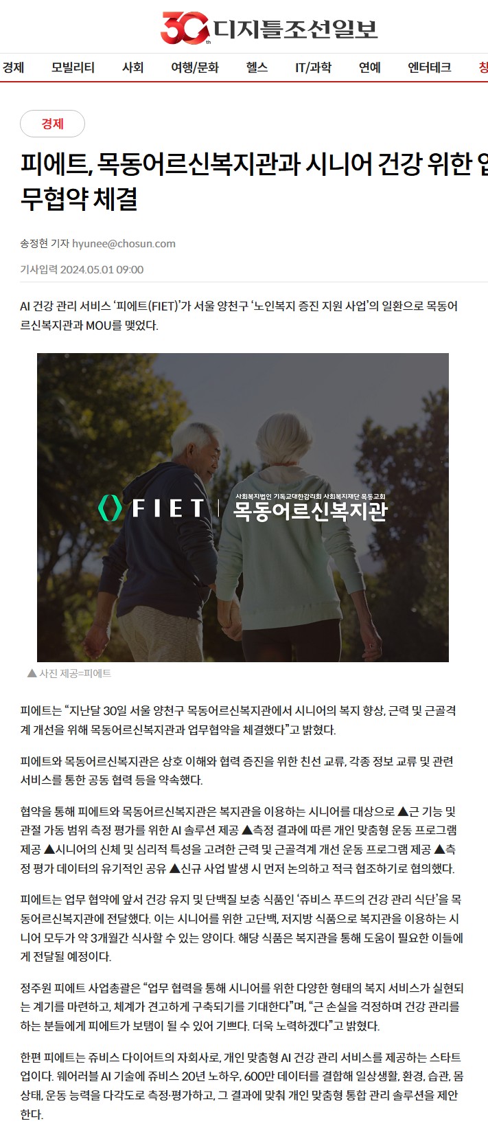 피에트, 목동어르신복지관과 시니어 건강 위한 업무협약 체결